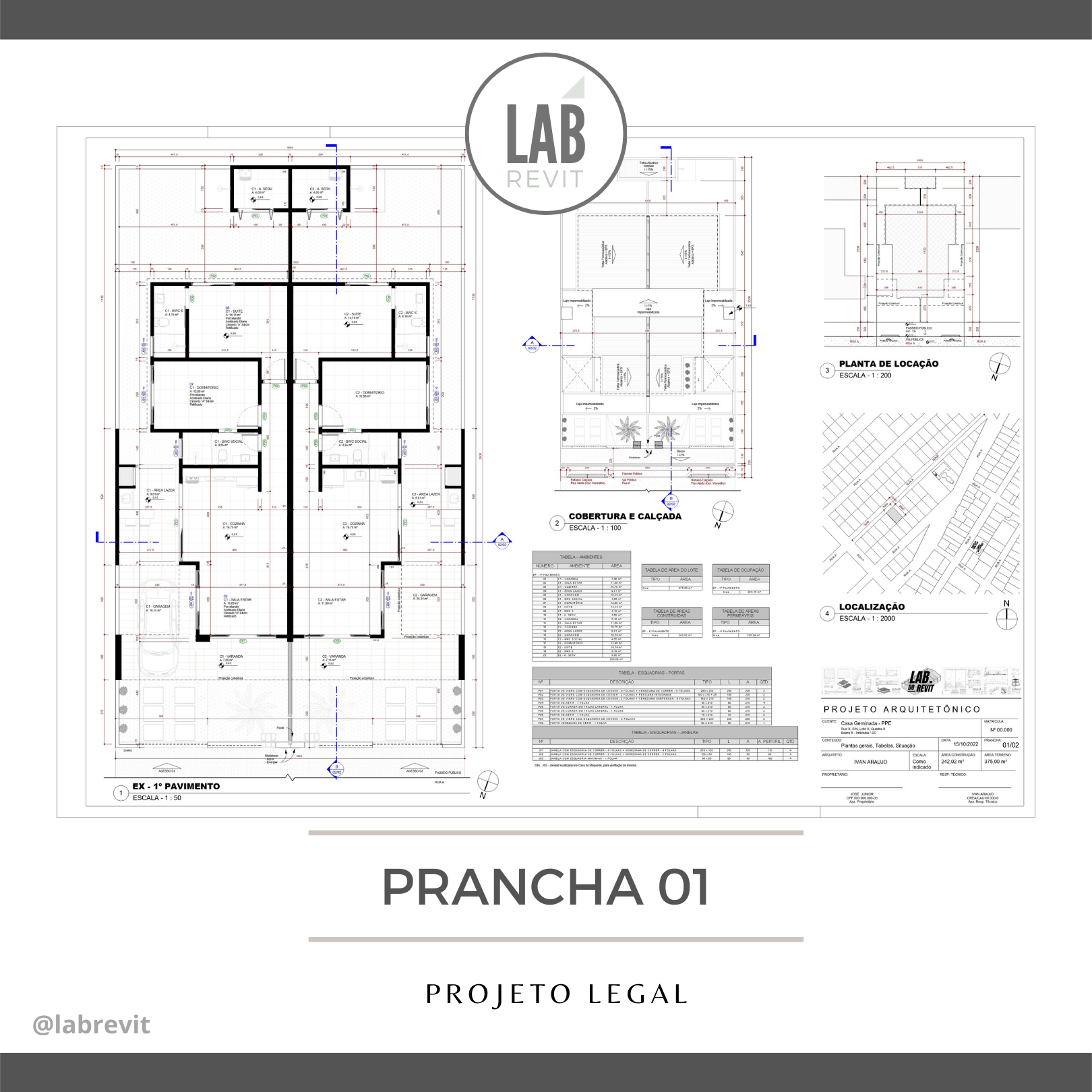 o modelo 3D, as plantas, os cortes e as fachadas detalhadas, as perspectivas, as tabelas e as pranchas finais para aprovação.
